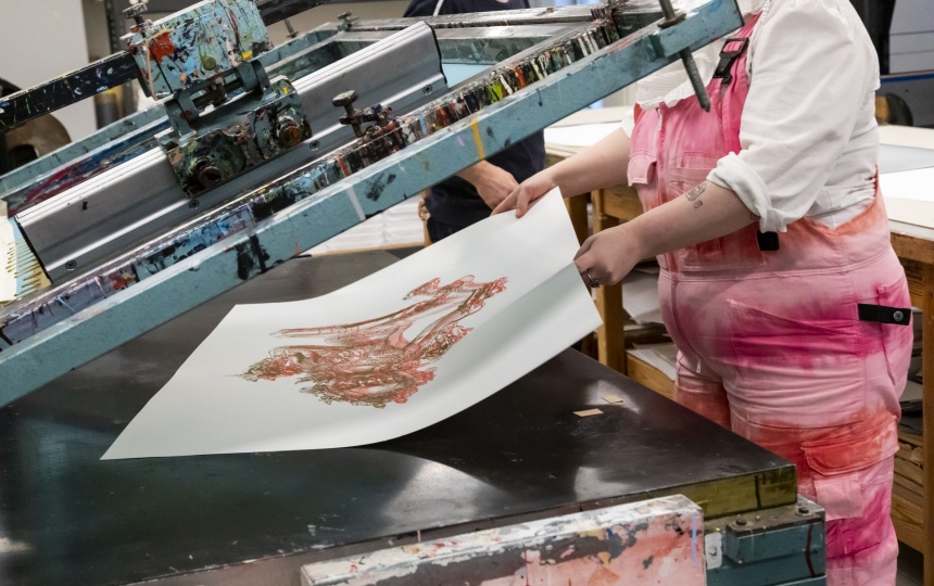 På Laboratoriet for Serigrafi og Risografi arbejder de studerende ofte med fremstillingen af værker på papir eller andet materiale. Ud over den konkrete tilegnelse af ny teknisk viden og materialeforståelse, er undervisningen i de forskellige grafiske metoder og processer også en måde for den studerende at træne og udvikle sin praksis inden for billeddannelse gennem det forhåndenværende materiale.