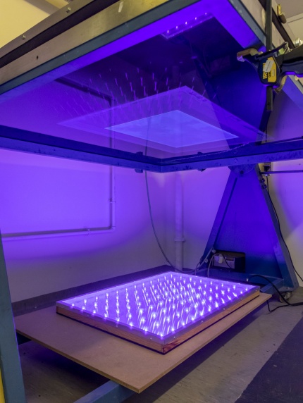 Billederne ovenfor er fra Laboratoriet for Serigrafi og Risografi. Laboratorieunderviseren giver to studerende undervisning i serigrafi – en grafisk metode, som er kendetegnet ved at man via en såkaldt stencil kan trykke mange farvelag oven på hinanden på et trykkemateriale, typisk i store oplag.